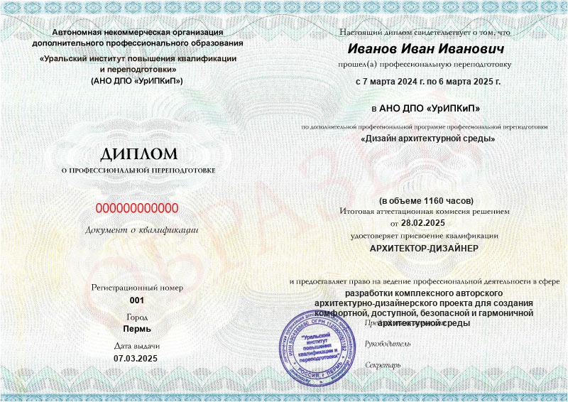 • Диплом о профессиональной переподготовке АНО ДПО «НАРХСИ» с присвоением квалификации «Архитектор-дизайнер».