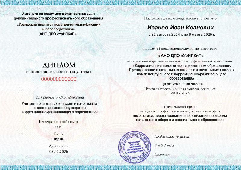Да, дипломы и удостоверения оформляются в соответствии с действующим законодательством РФ. Документы печатаются на специальных бланках, заверяются печатью АНО ДПО «УрИПКиП».